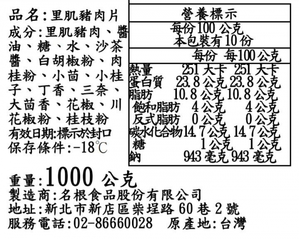 一律使用0.4cm的上等豬里肌肉片醃漬而成,使用的醃料為名根烤肉獨門秘方,因本身已經有醃料的味道,不須額外加太多烤肉醬就很美味!