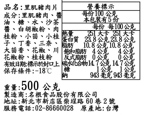 一律使用0.4cm的上等豬里肌肉片醃漬而成,使用的醃料為名根烤肉獨門秘方,因本身已經有醃料的味道,不須額外加太多烤肉醬就很美味!